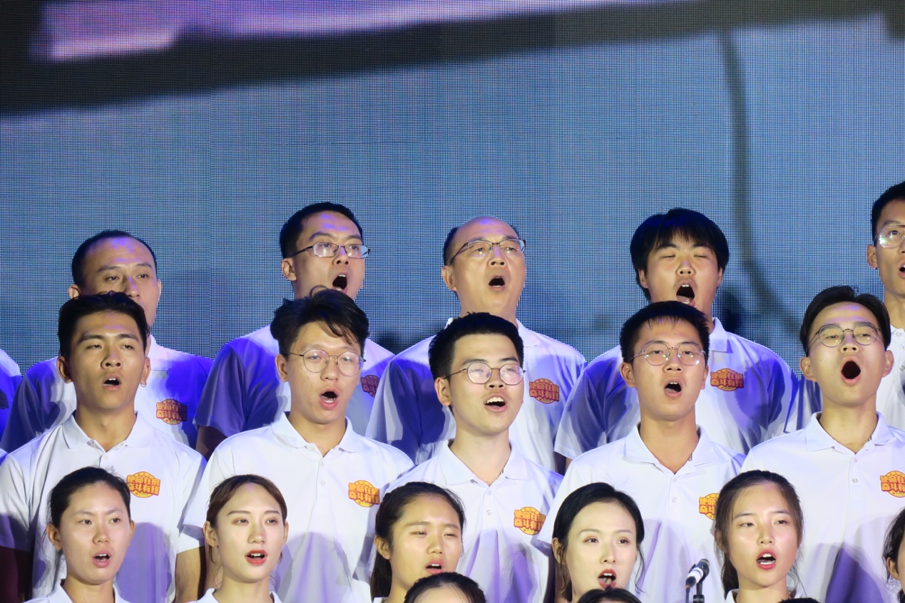 合唱汇演于19:00准时开始,舞台上表演者们歌声嘹亮,慷慨激昂,表达着心中对祖国的热爱,以合唱的方式回顾一代代奋斗者拼搏不止,铸就出的那一段段不朽篇章。